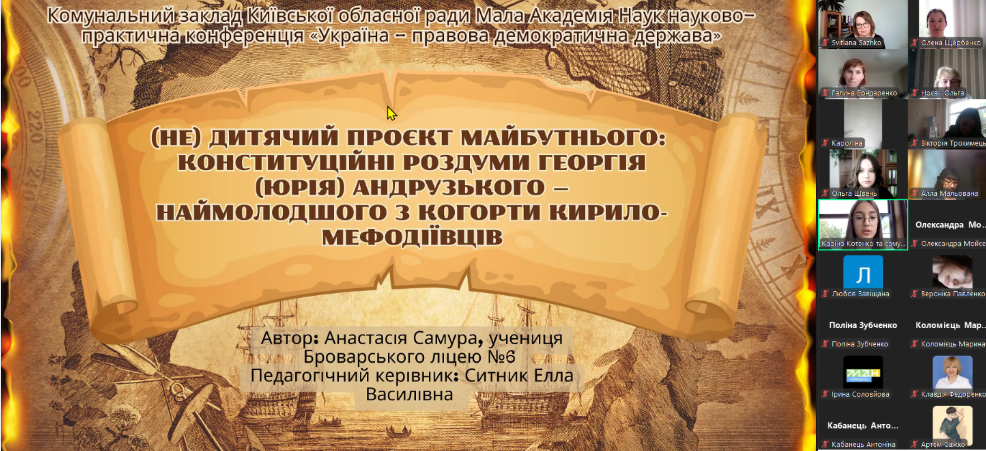 27 червня 2025 року Комунальним закладом Київської обласної ради «Мала академія наук учнівської молоді» проведено обласну учнівську науково-практичну конференцію «Україна – правова демократична держава» для учнів-членів Київського обласного територіального відділення МАН України до Дня Конституції України