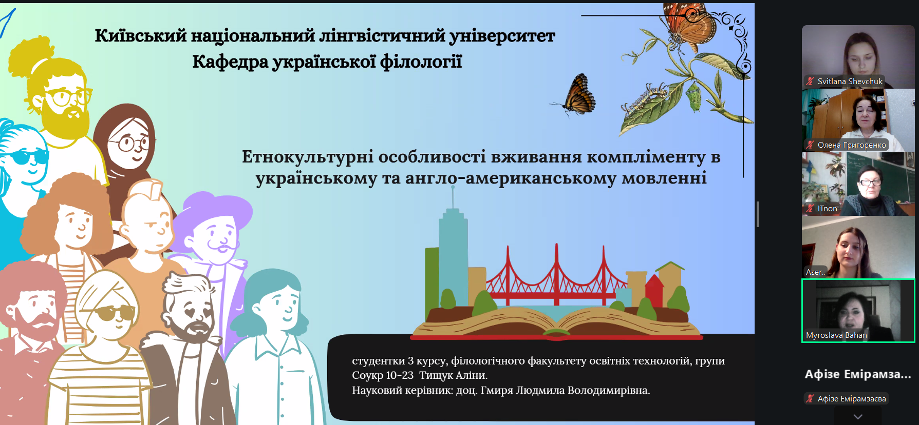 Етнокультурні особливості вживання компліменту в українському та англо-американському мовленні висвітлила студентка Анастасія Тищук, порівнюючи мовні стратегії ввічливості та національні комунікативні коди.